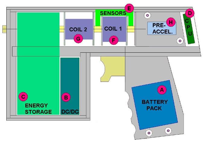 The GP-219 Gauss Pistol is a self-contained, two-stage coil gun. What
